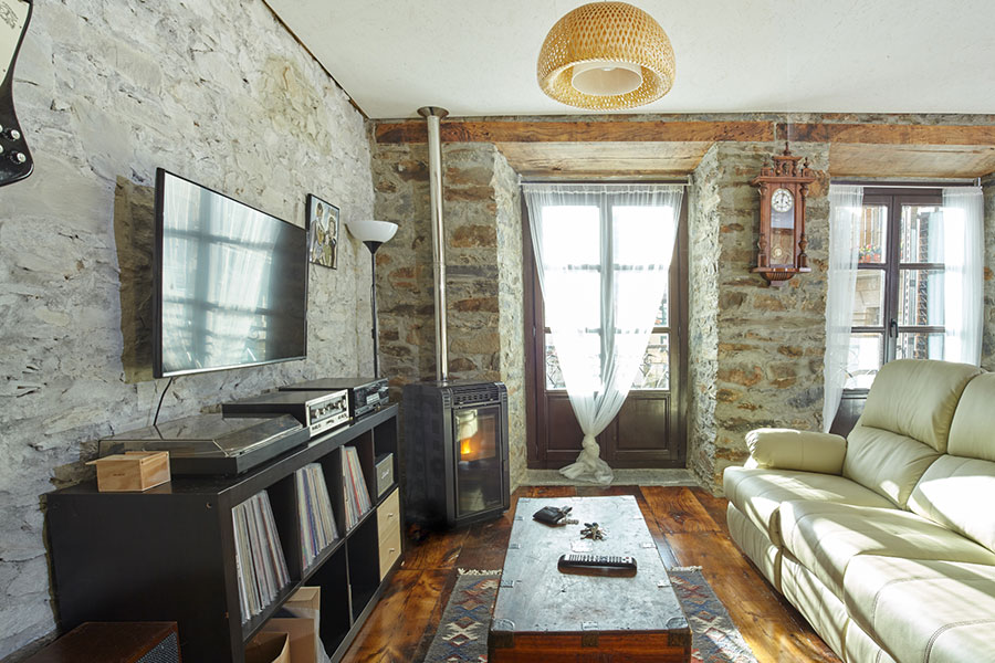 Para conseguirlo, despejamos el local y lo dejamos diáfano. Levantamos el encalado de los muros de carga para dejar la piedra vista y acuchillamos y tratamos con aceite el forjado de madera.