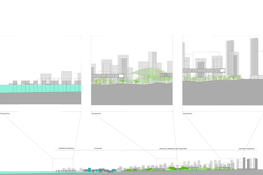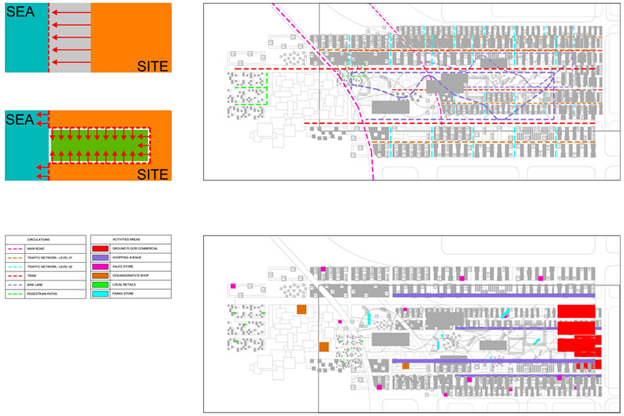 In order to reinforce this concept we propose two block rings with a different density each. The outer one contains the 60% of the dwellings and the inner one reduces its density to the 40% of the dwellings. Amenities and facilities are located on the street level of each block. The ocean park is located on the sea front by the park, which is the best location to achieve the best connection both to the sea and tourists.