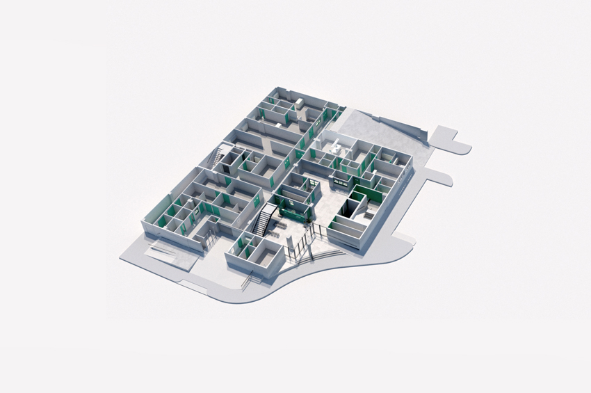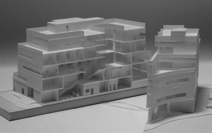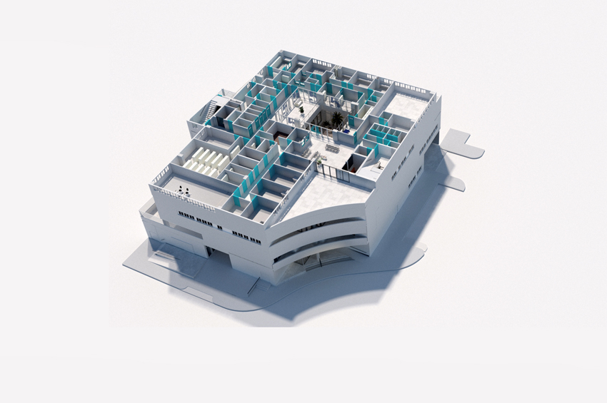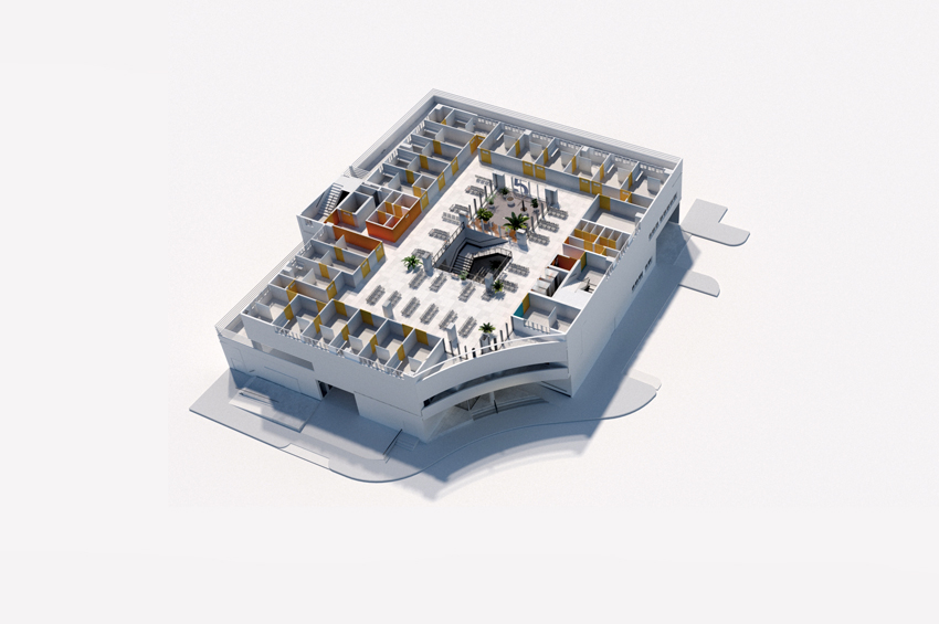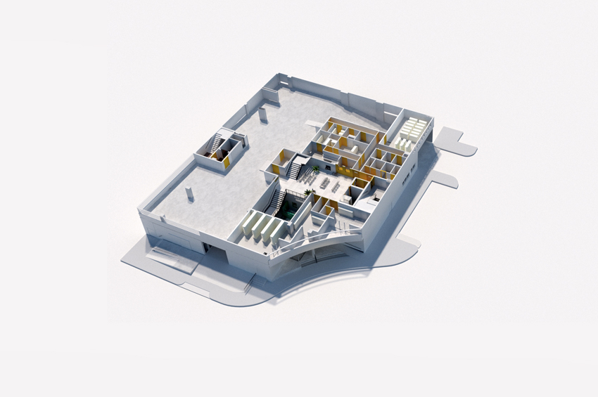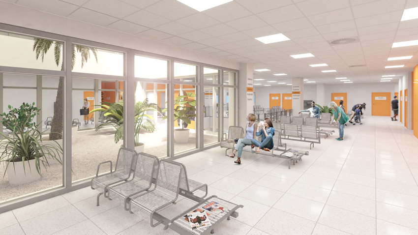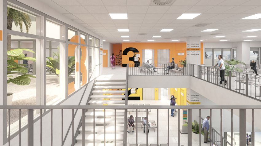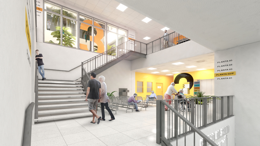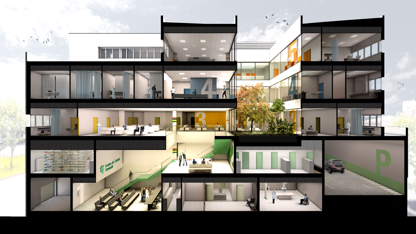 A 5-storey building due to the extensive functional program and limited dimensions of the plot. In spite of the programmatic complexity, there is an intention of creating legible and pleasant spaces for users waiting areas, which, from the same entrance, allows visual connections with the consultation floor and whose patio organizes and provides natural light all the spaces for the waiting areas.