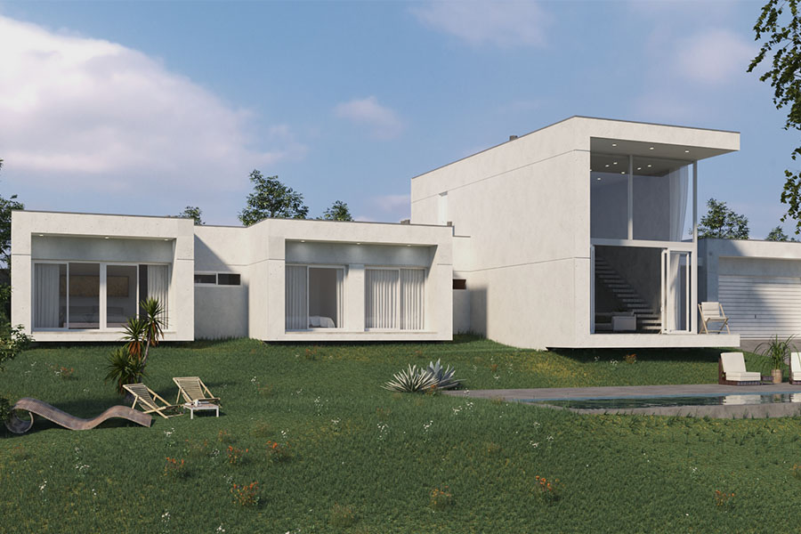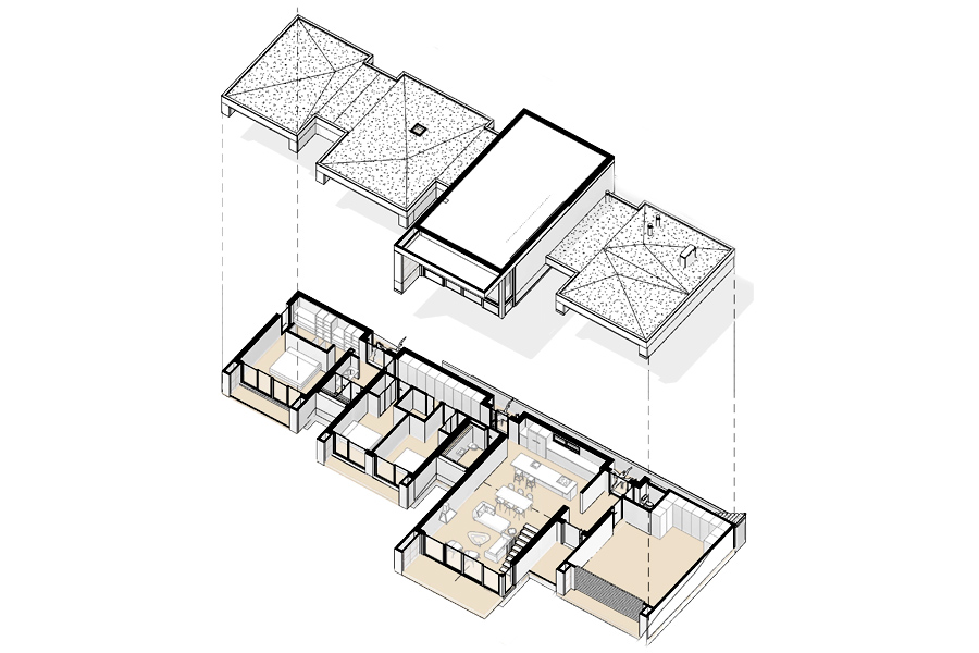 A house that is organized as a logical sequence of volumes each one with a specific use and a position according to the movements of access and operation in the house: garage, living room and bedrooms, to maximize the windows towards orientation and views.