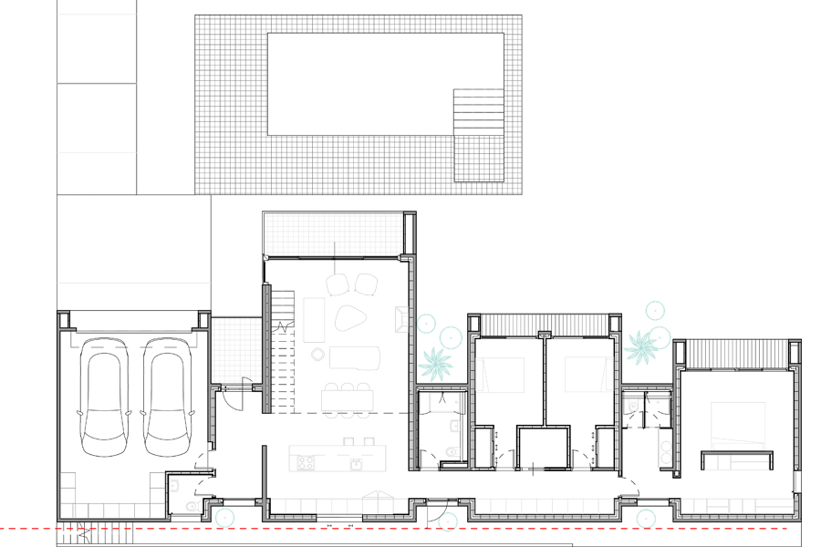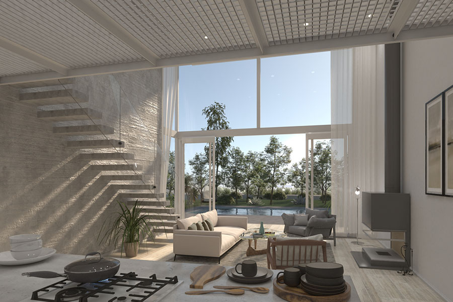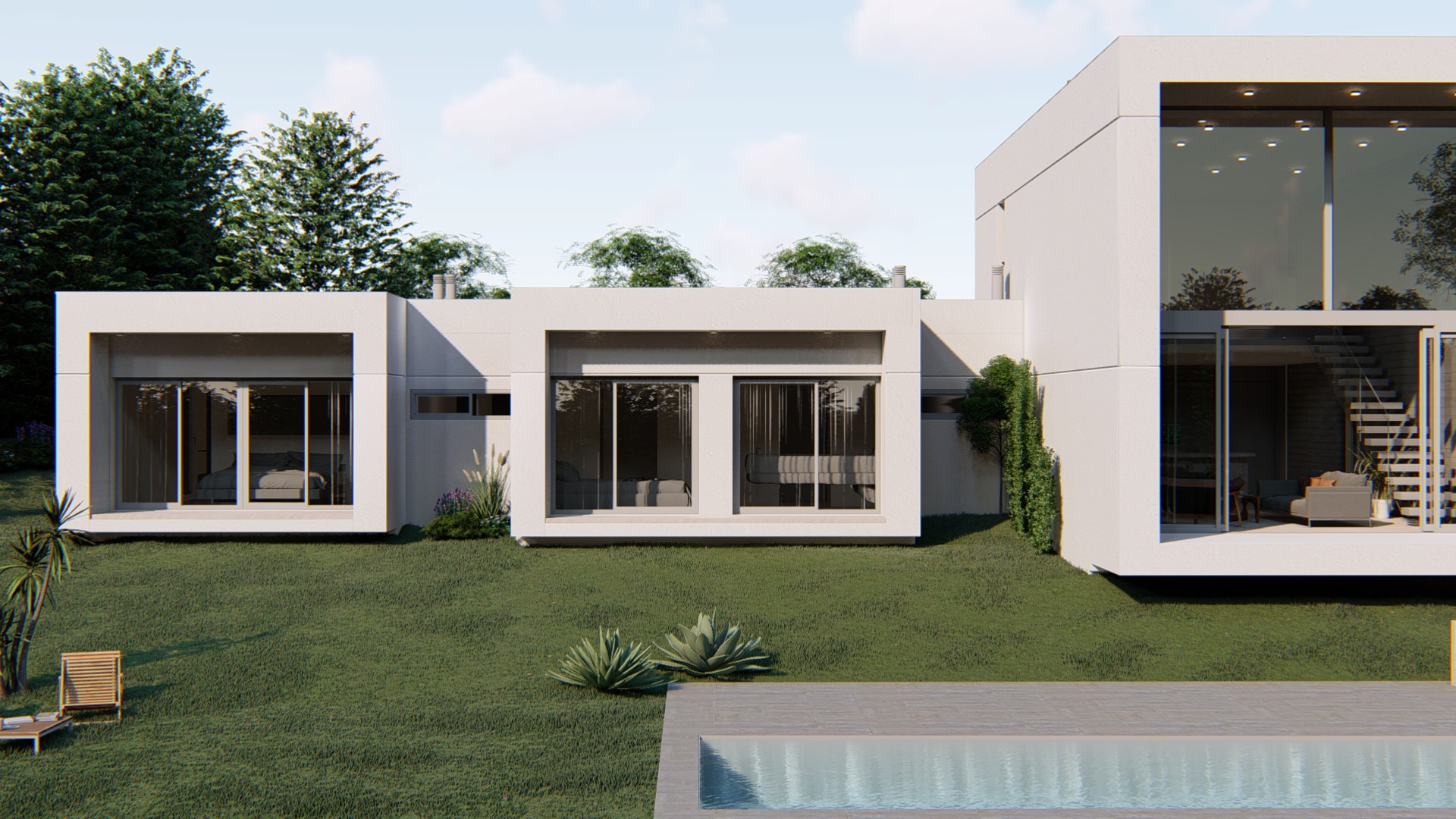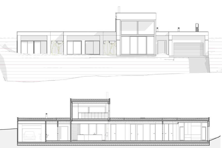 The largest volume groups the public areas of the house, forming a single space in double height and a curtain wall to dominate the garden and the views.