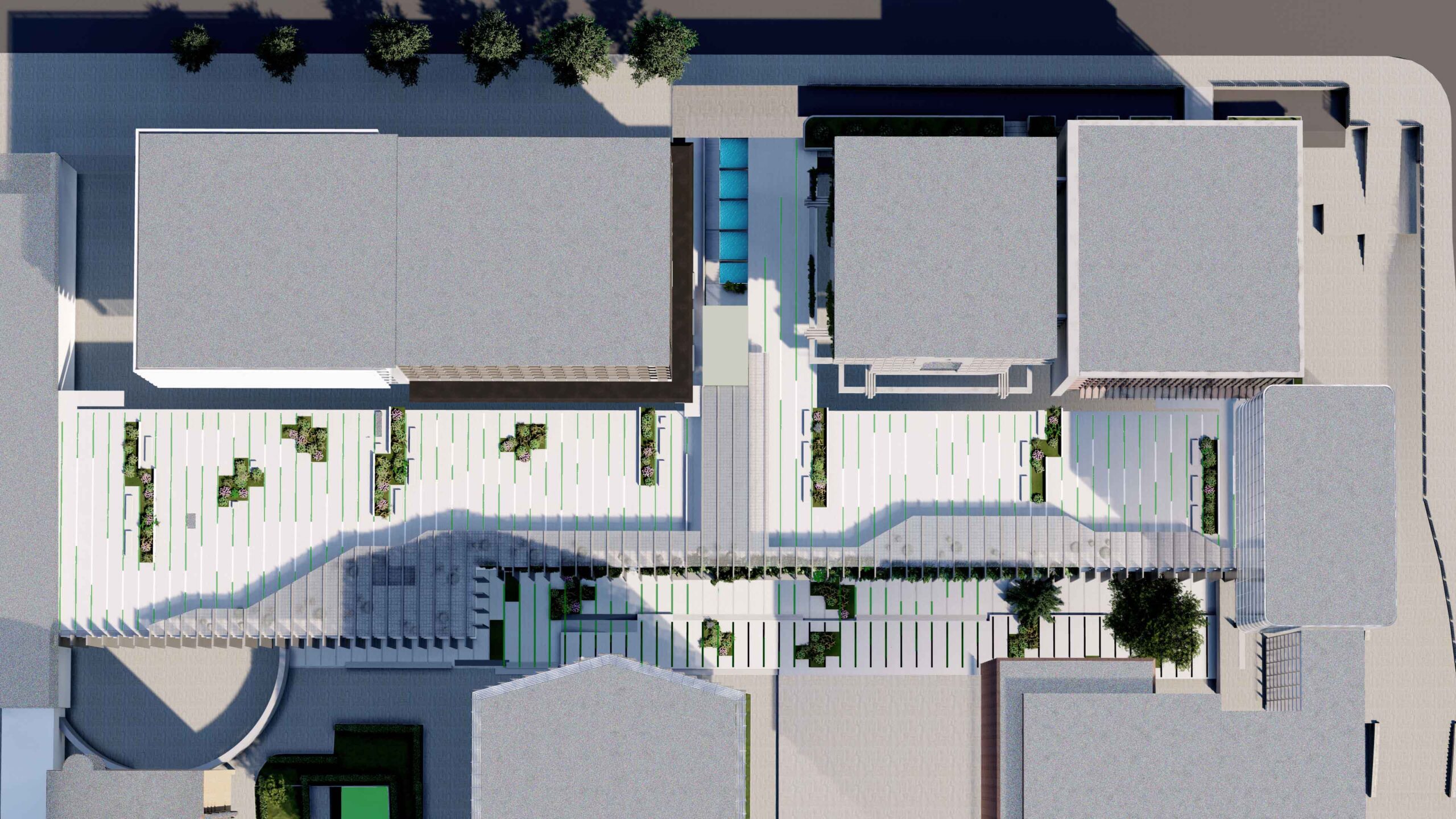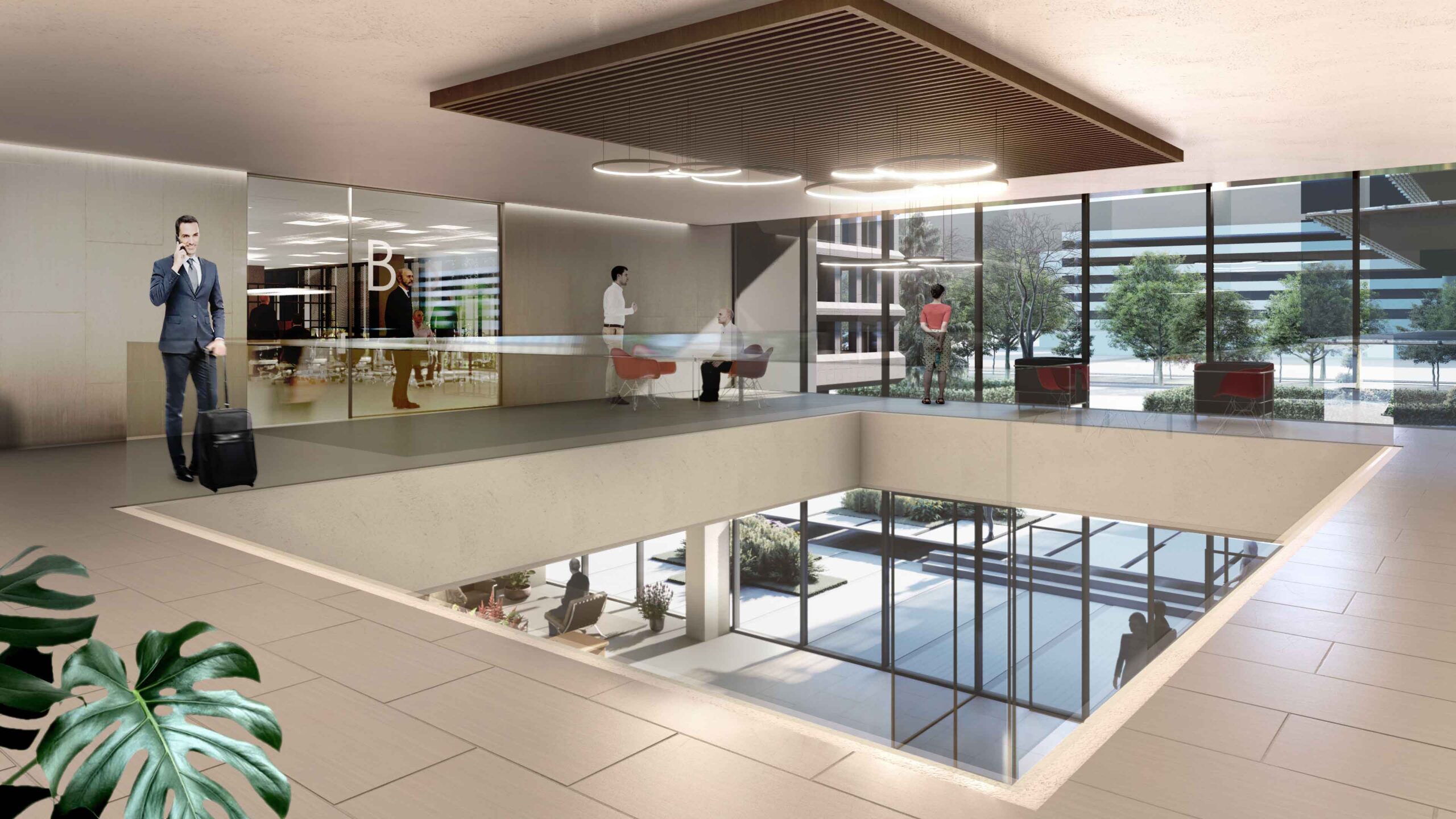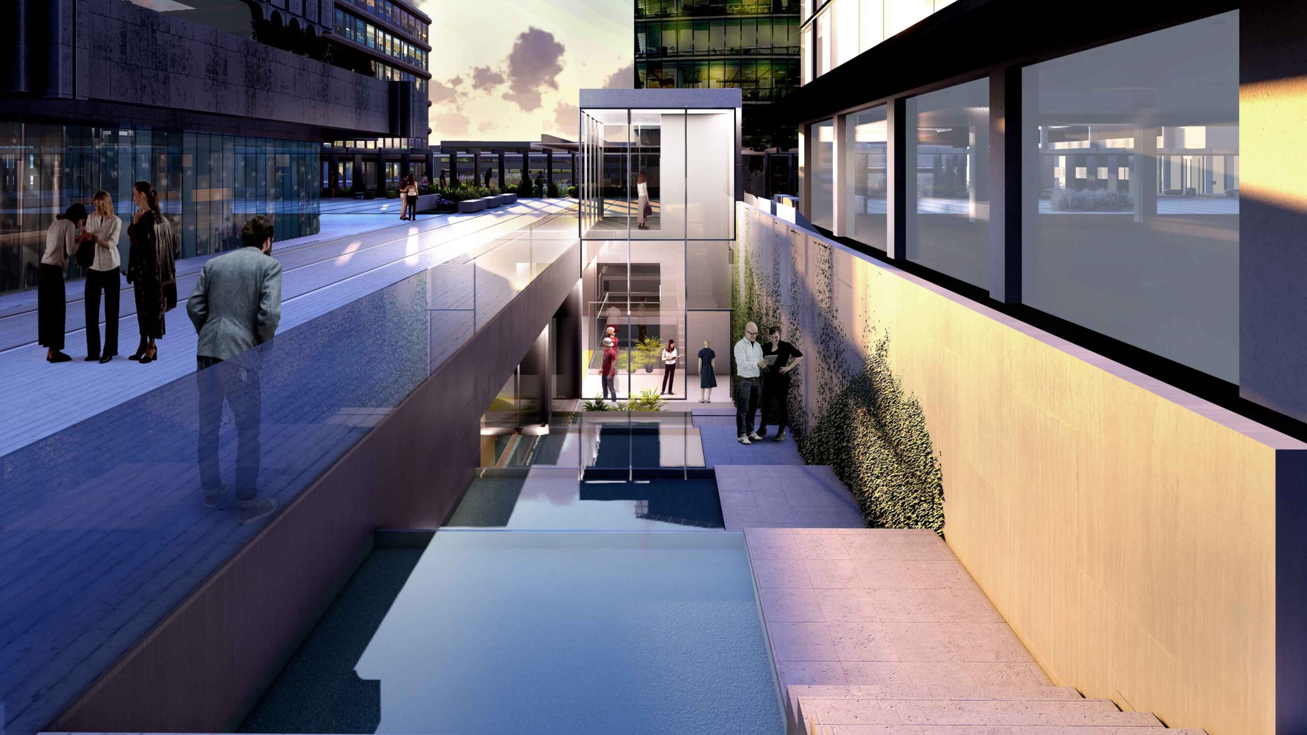 Además, la propuesta propone crear una entrada a la Calle Serrano, de la que actualmente carece, permitiendo establecer una conexión visual en el interior entre ambas fachadas y anunciando el edificio mediante una entrada representativa, con un escalonamiento acompañado por láminas de agua. Estás escaleras aportan además luz natural sobre una parte del edificio hasta ahora sin luz y con carácter residual y que se transformarán en atractivos espacios de trabajo.