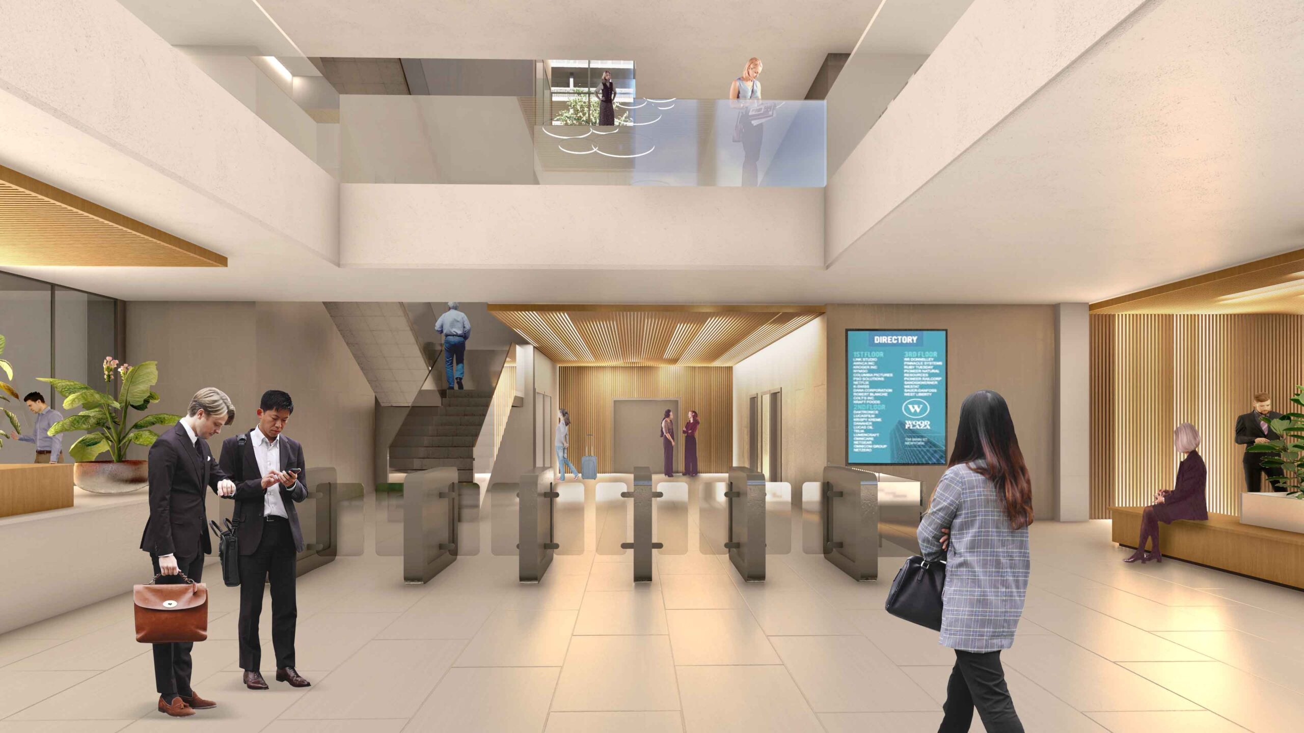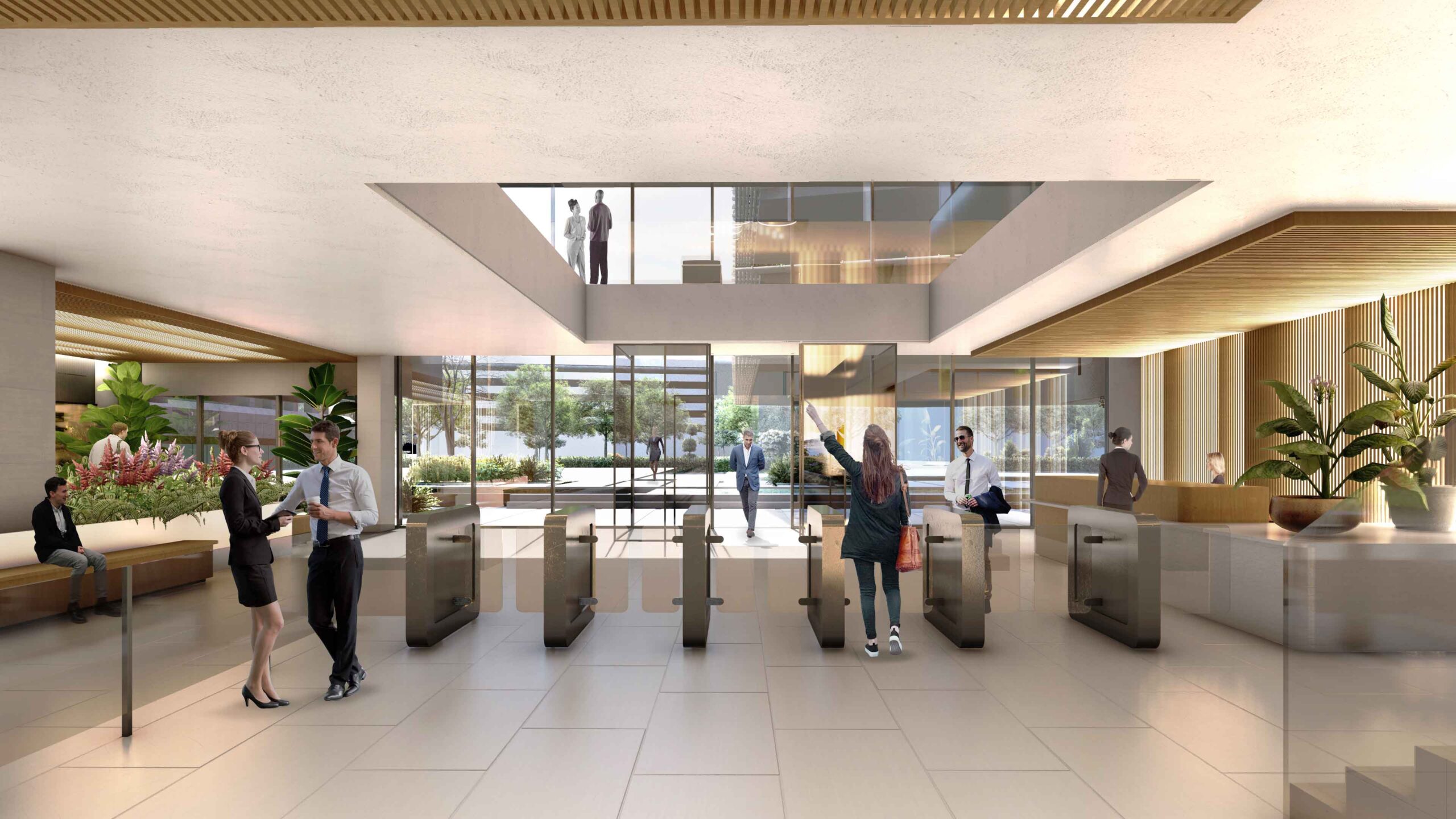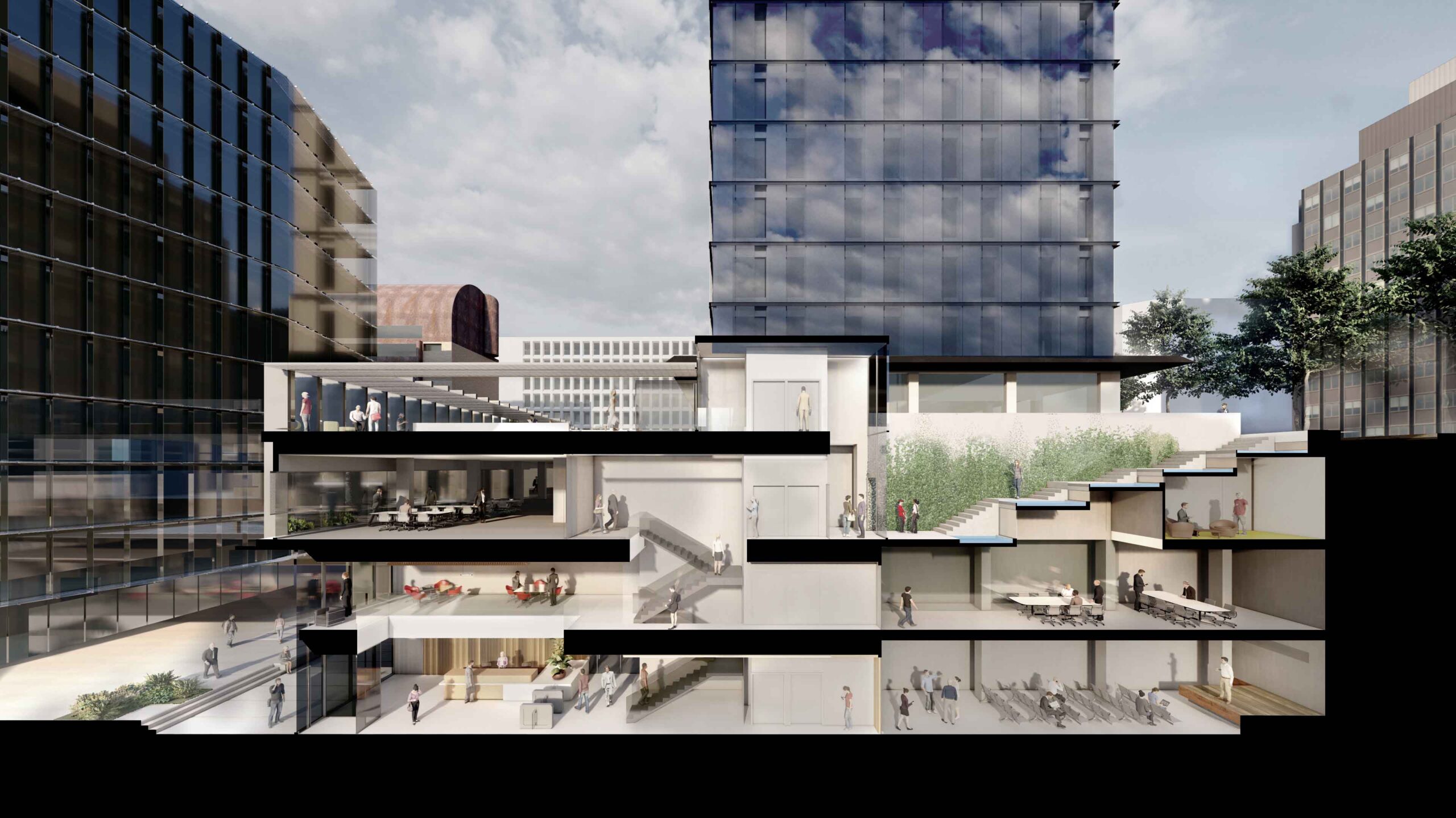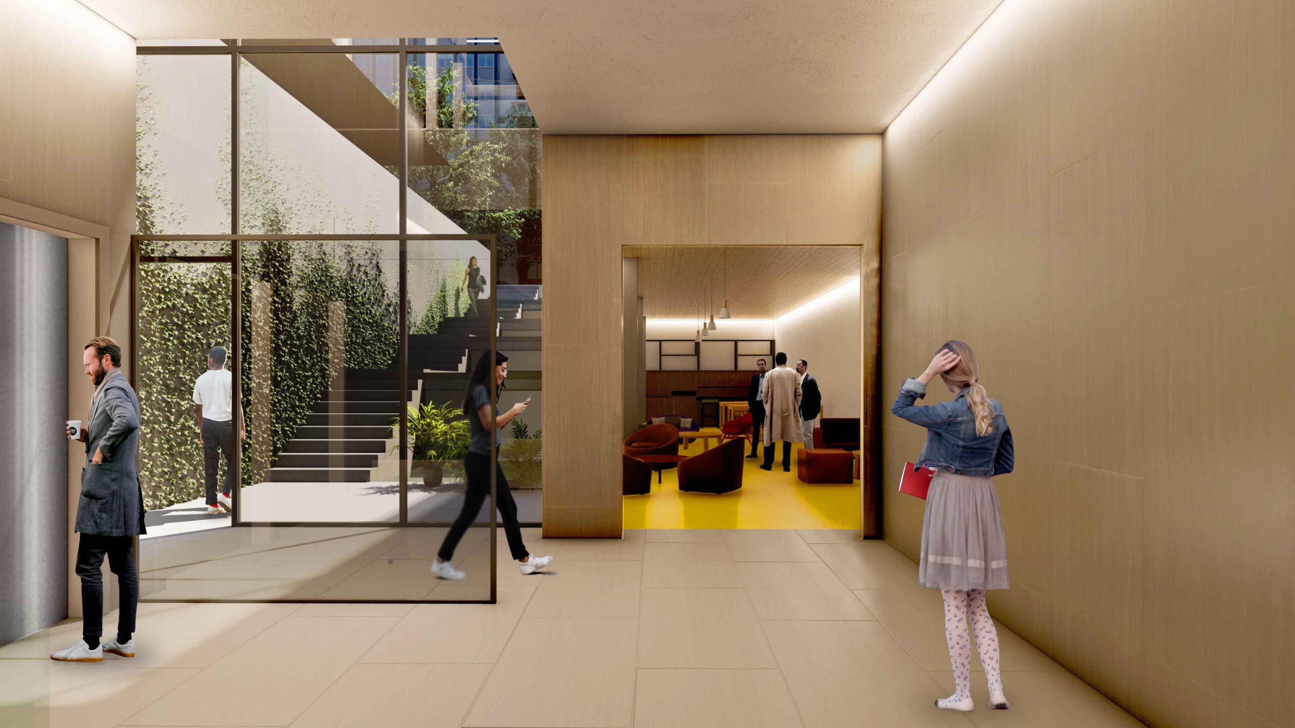 Además, la propuesta propone crear una entrada a la Calle Serrano, de la que actualmente carece, permitiendo establecer una conexión visual en el interior entre ambas fachadas y anunciando el edificio mediante una entrada representativa, con un escalonamiento acompañado por láminas de agua. Estás escaleras aportan además luz natural sobre una parte del edificio hasta ahora sin luz y con carácter residual y que se transformarán en atractivos espacios de trabajo.