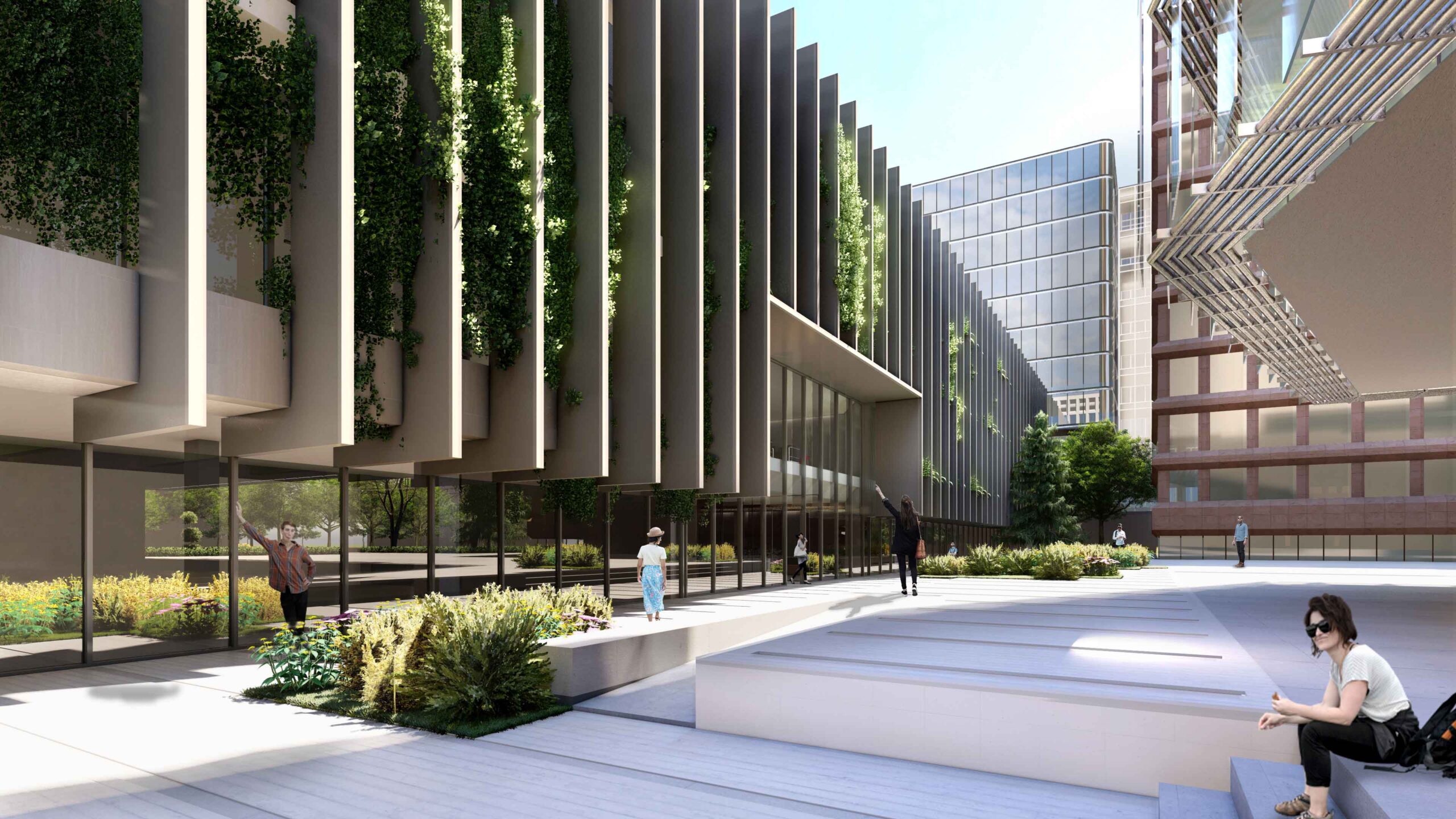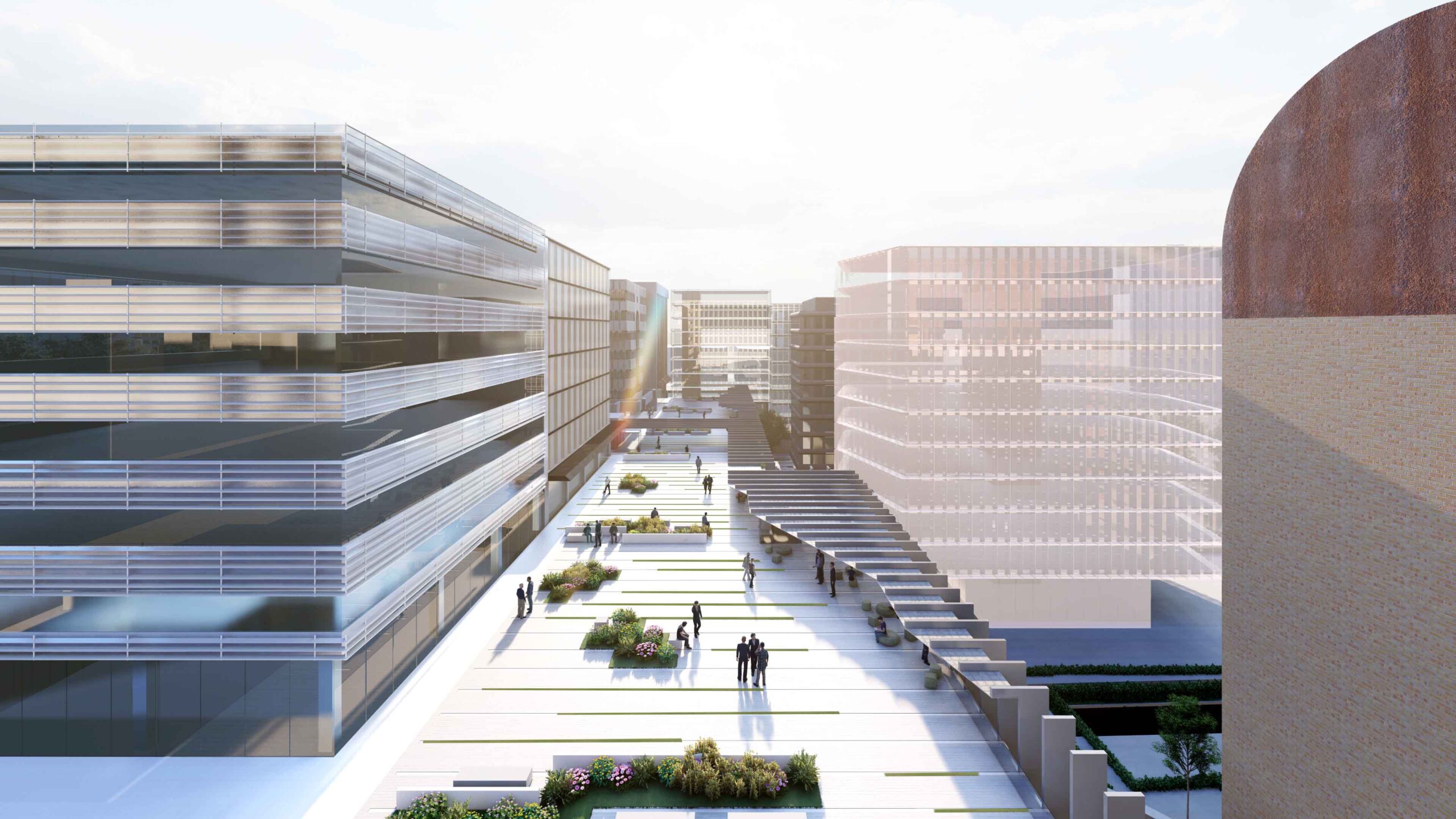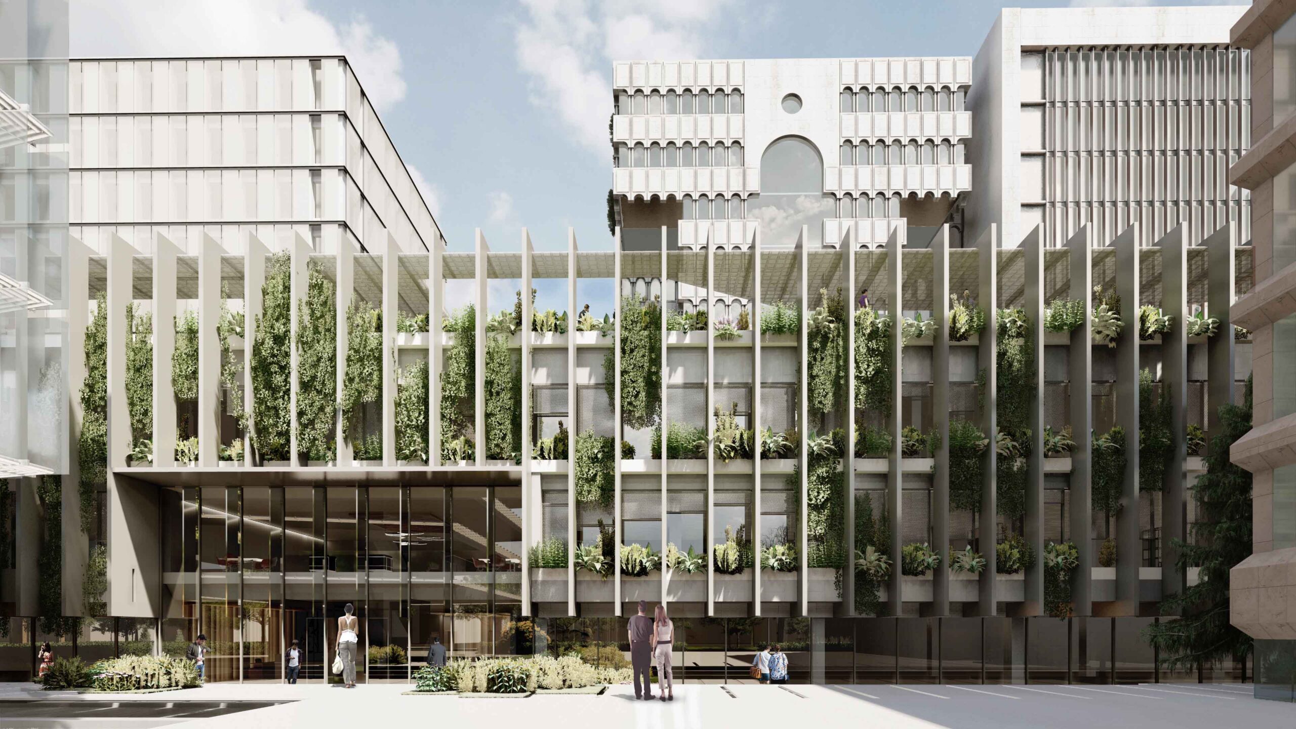 Se plantean varias estrategias para revalorizar un edificio con una excelente ubicación, pero prácticamente escondido. A nivel de fachada principal al Paseo de la Castellana, unas costillas sirven de protección del soleamiento de poniente y soporte para un jardín vertical en fachada, generando un ritmo potente al enfatizar la horizontalidad del edificio. Estos elementos tienen una continuidad en cubierta, sirviendo de pérgolas para crear una gran terraza que da uso a una actual cubierta, y aprovecha las vistas lejanas hacia el oeste.