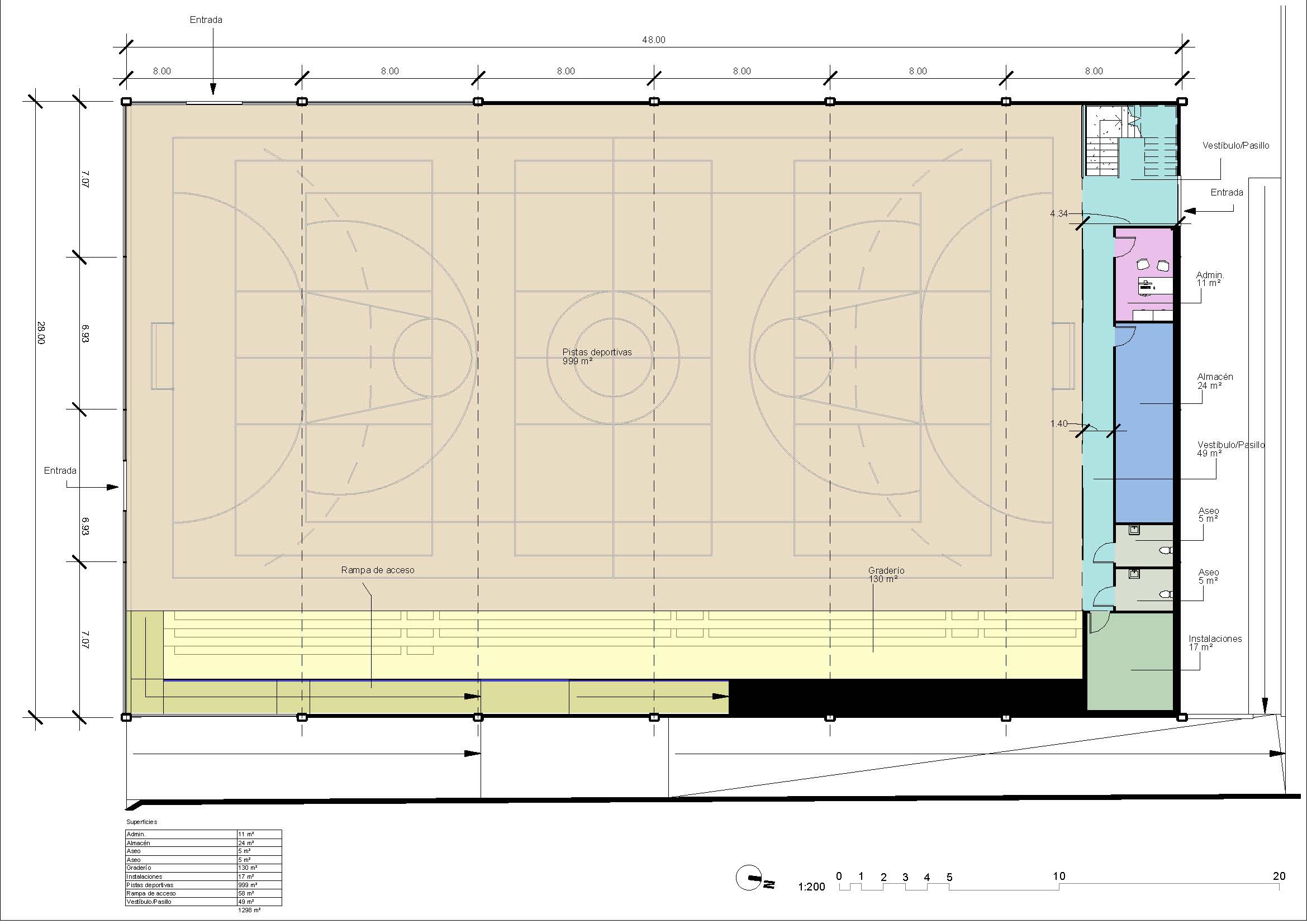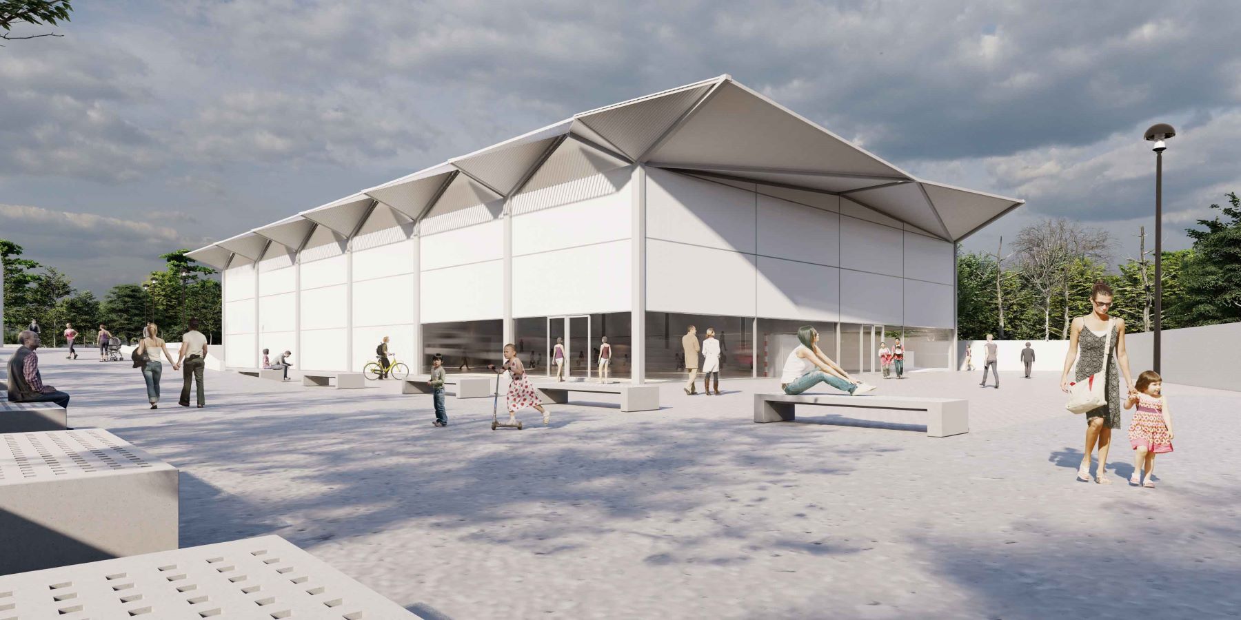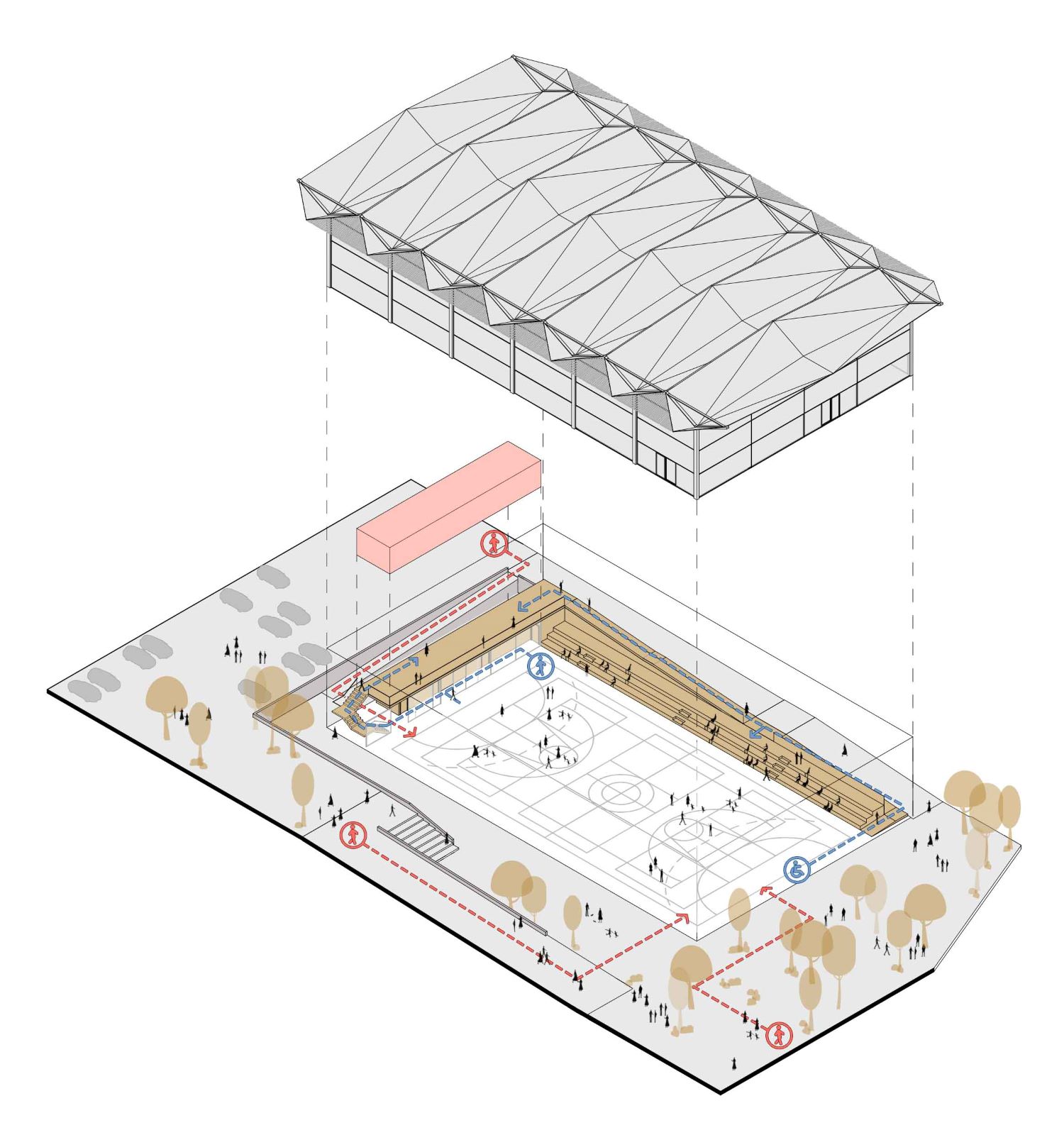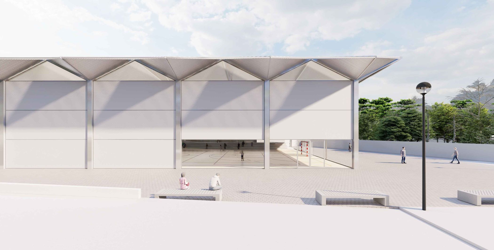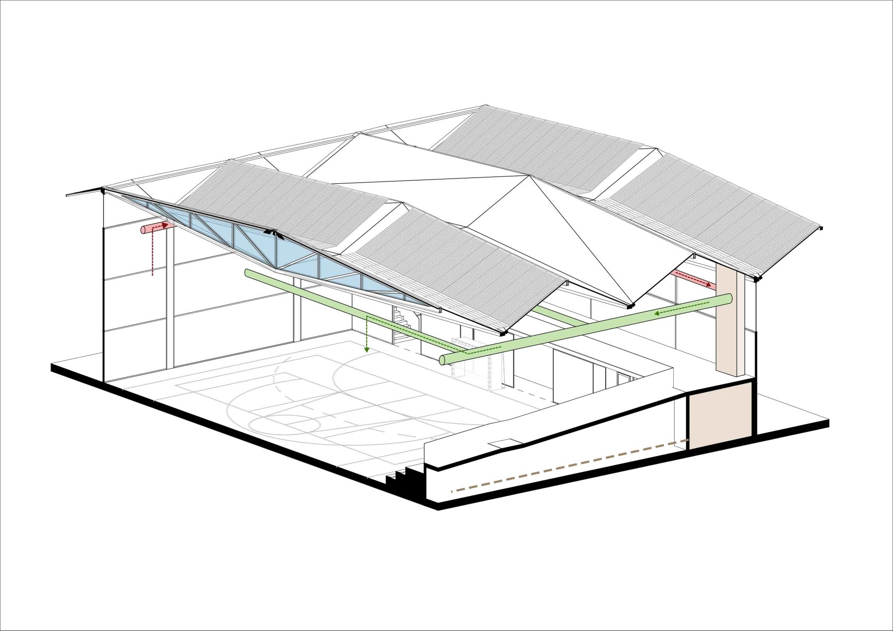 El edificio deportivo propuesto se concibe como una estructura ligera, tanto formal como constructivamente, diseñada para ofrecer un espacio interior amplio, diáfano y altamente luminoso. La luz natural se aprovecha de forma controlada y homogénea, garantizando condiciones óptimas para la práctica de distintas disciplinas deportivas.