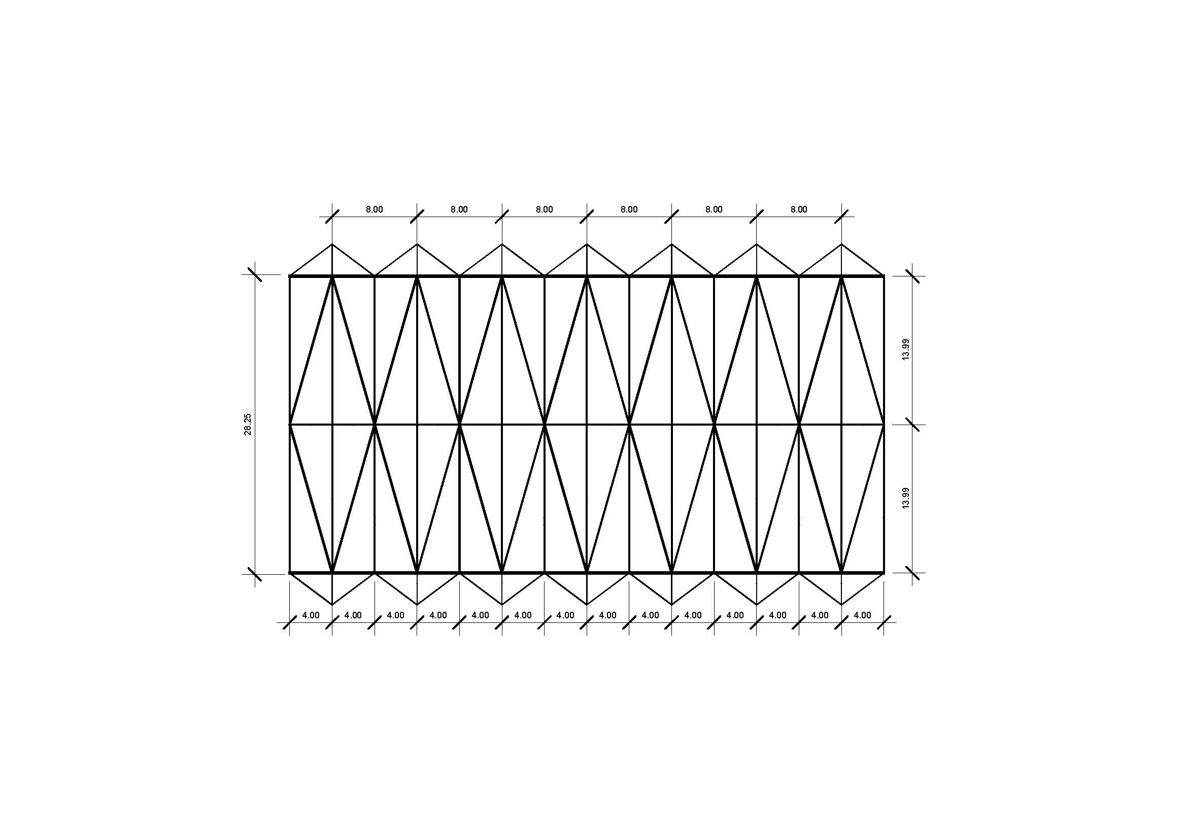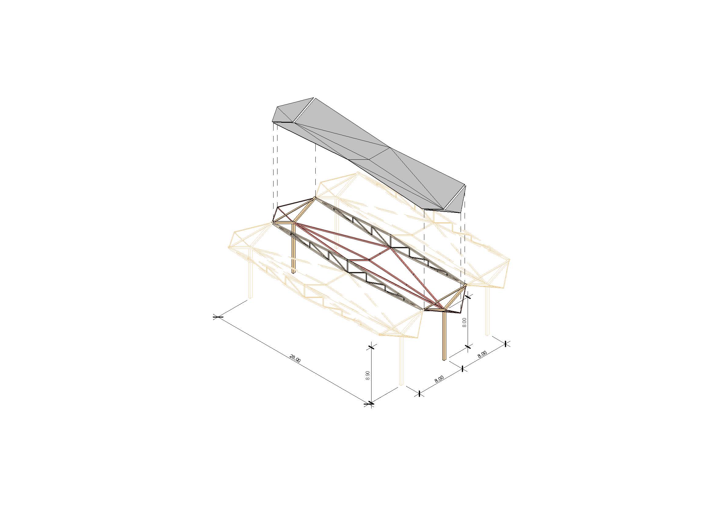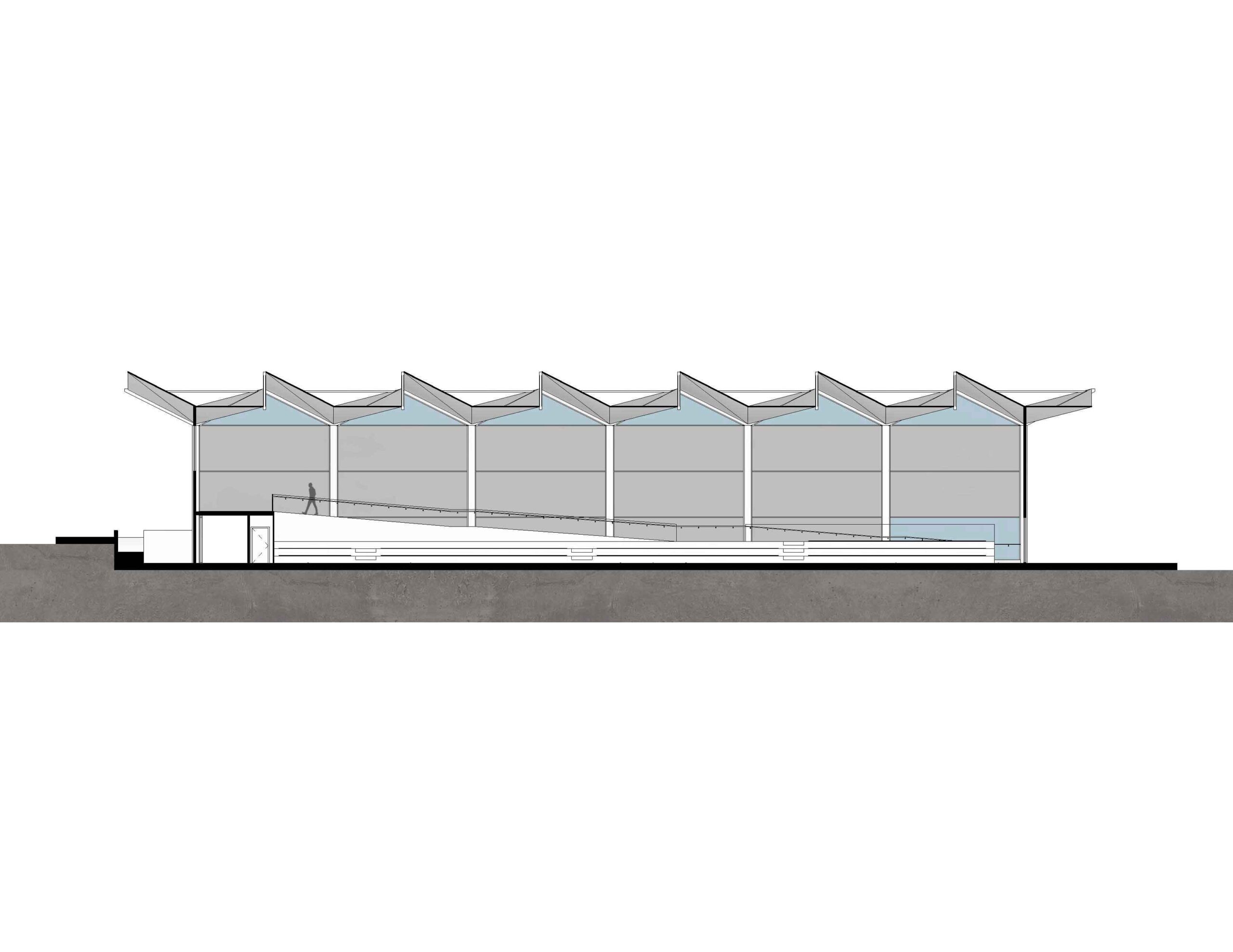 La estructura principal se resuelve mediante cerchas romboidales que cubren la luz transversal, actuando como lucernarios para la entrada de luz norte. Sobre ellas se apoyan estructuras trianguladas que conforman las pendientes de la cubierta, permitiendo una eficiente recogida de aguas y ocultando bajantes en los pilares. El cerramiento acristalado en planta baja permite una relación directa entre interior y exterior, con posibilidad de apertura parcial para ventilación natural.